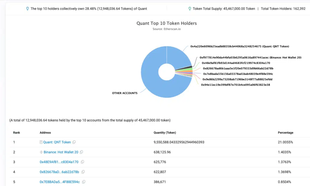 Gli holder stanno accumulando, in questa immagine, tratta da Etherscan, mostra la distribuzione dei token Quant tra i principali detentori.