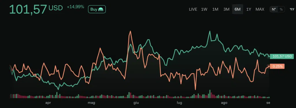 Dopo un picco significativo a novembre 2024, con indirizzi attivi oltre quota 2.000 e nuovi indirizzi vicini ai 2.300, si osserva una fase di contrazione tra dicembre e aprile 2025, periodo in cui il prezzo ha subito un calo marcato. Successivamente, tra maggio e agosto 2025, gli indirizzi attivi si sono stabilizzati attorno a 900-1.000 unità, mentre i nuovi indirizzi (oscillano intorno a 200. Al 31 agosto 2025 il prezzo è circa 103,7 USDT, con 947 indirizzi attivi e 200 nuovi indirizzi, segnalando ancora una partecipazione moderata.