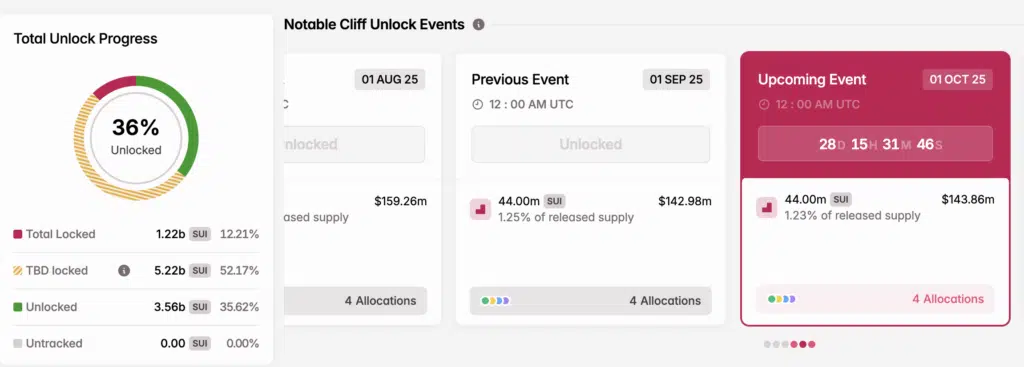Il 1° settembre 2025 $SUI ha registrato un nuovo sblocco di circa 44 milioni di token, pari a circa 145 milioni di dollari e all’1,25% dell’offerta totale. Il meccanismo di rilascio è mensile: anche il 1° agosto era stato completato uno sblocco di dimensioni simili, per circa 167 milioni di dollari.
