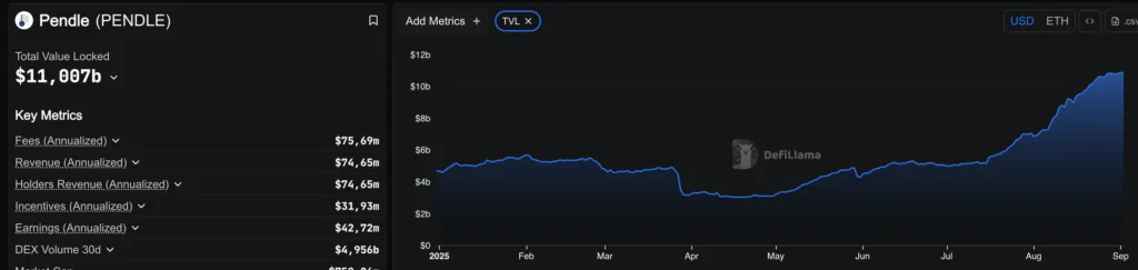 In settembre Pendle ha raggiunto un TVL (total value locked) record di 11,007 miliardi, mostrando resilienza nella domanda di rendimento. Ha lanciato Boros su Arbitrum, piattaforma per la tokenizzazione dei tassi di funding di future perpetui su BTC ed ETH.