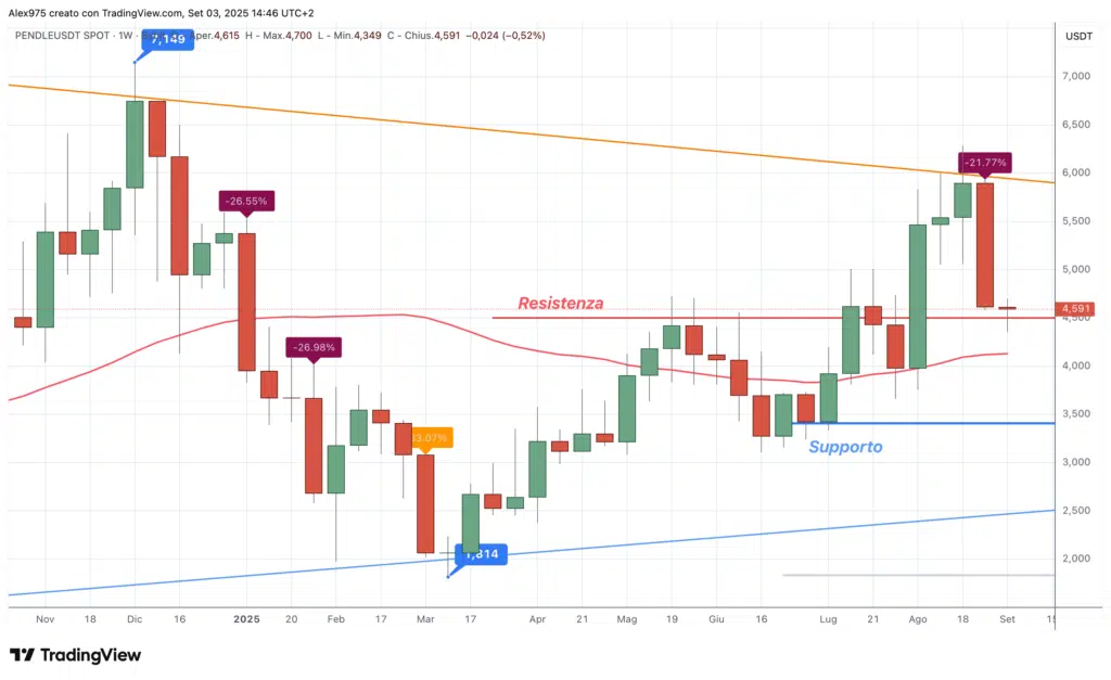 Osservando il grafico weekly di Pendle abbiamo una panoramica a partire dall’estate scorsa, anche se è un token quotato sugli exchange dal 2022. Ad agosto 2024 ha toccato un minimo a 1,84 USDT, da cui è partita una leg up rialzista che ha spinto il prezzo a un massimo di periodo a 7,18 USDT. Il massimo assoluto di Pendle era stato raggiunto ad aprile a 7,52 USDT.