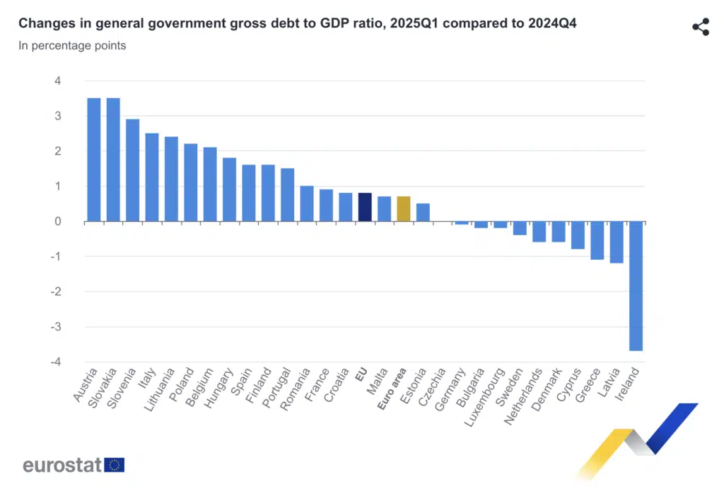 La Germania, prendiamo ancora i più virtuosi o quasi, è passata dal 58% al 68% di debito sul PIL. Ovvero per ogni 100€ di PIL, ne aveva prima 58 di debito e poi, subito dopo la pandemia, 68.