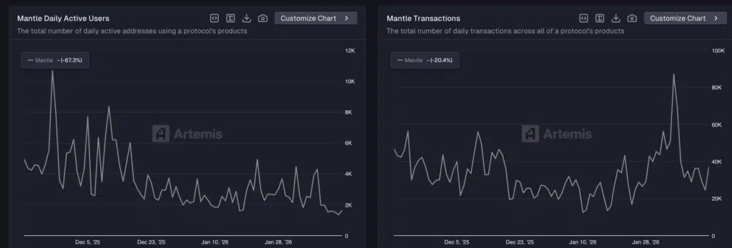L’andamento di Mantle mostra un andamento volatile dell’attività on-chain. Attualmente circa 1.6K Daily Active Users, dato che evidenzia un ridimensionamento rispetto ai picchi precedenti. Le Transactions giornaliere si attestano a 37.1K, mostrando comunque un livello operativo ancora significativo sulla rete.