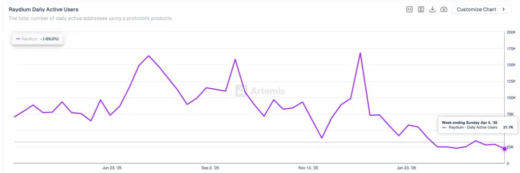 La metrica Daily Active Users di Raydium evidenzia un calo marcato nell’ultimo anno, con una contrazione del -69%. Dopo i picchi sopra 150.000 utenti nel 2025, il dato attuale si attesta intorno a 21.700 indirizzi attivi.