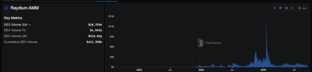 I volumi di trading confermano il ruolo centrale di Raydium: circa 18,9 miliardi di dollari negli ultimi 30 giorni, con 59 miliardi su base settimanale e 510 milioni nelle 24 ore. Il cumulativo supera 611 miliardi. Il grafico evidenzia picchi significativi a inizio 2025, seguiti da calo dei volumi.