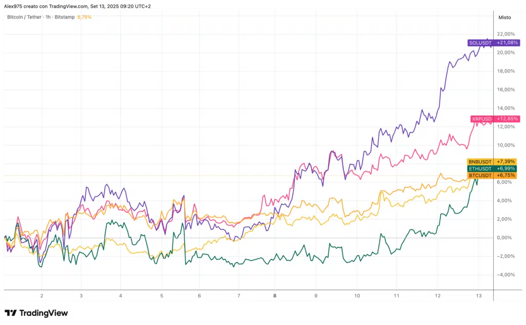 Nel grafico allegato, riportiamo l’andamento dei cinque token principali per capitalizzazione, che all’incirca cubano tra il 73 – 75% della market cap totale del settore. Sul grafico, spiccano proprio Solana e Ripple, per miglior crescita, mentre Ethereum e Bitcoin rimangono i più debole. Tuttavia, ETH registra un rialzo di oltre il +200% dai minimi di aprile, cose che gli altri token non stanno facendo.