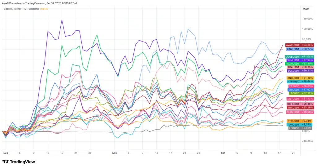 Tra i token che in questa estate stanno mostrando un movimento rialzista costante si fa strada Cardano (ADA) che attualmente quota 0,91 USDT. Considerando il suo rialzo dai primi di luglio al valore attuale, ADA sta registrando un incremento del +62%, posizionandosi tra i token della crypto Top 20 con le performance migliori. Il rialzo più alto dallo stesso periodo è stato quello di Chainlink, che nelle ultime ore è superato da Avalanche.