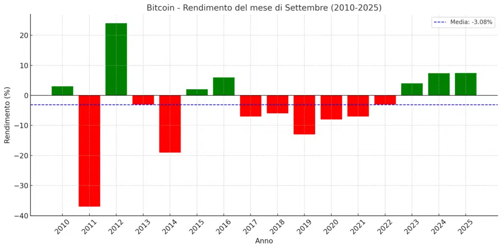 Il mese di settembre è storicamente debole per Bitcoin, con una media del −3,69% tra il 2010 e il 2024. In 15 anni osservati (escluso quello in corso), 9 volte ha chiuso in rosso e solo 6 in verde. Tuttavia, gli ultimi tre anni stanno segnando un’inversione del trend stagionale, con settembre positivo già nel 2023, 2024 e forse nel 2025, a dimostrazione che la stagionalità non è una regola fissa.