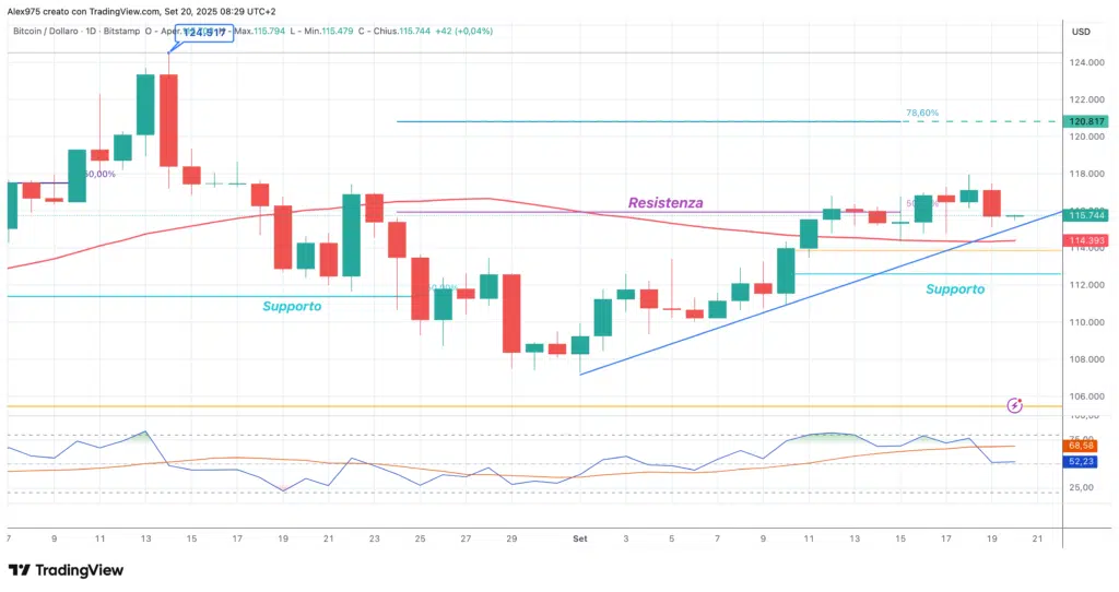 Attualmente Bitcoin è in ritracciamento del suo ATH a 124.517$, con un calo del −6,60%. Allo stesso tempo, però, resta in rialzo di circa l’8% rispetto al minimo registrato a inizio settembre in area 107.400$.
