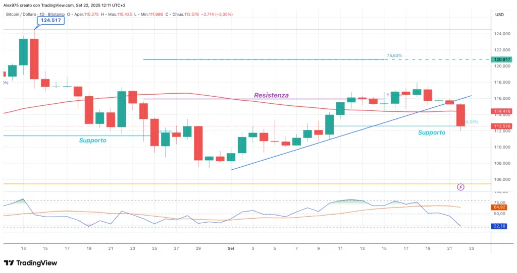 Focalizzandoci sulla situazione di Bitcoin, si può osservare come il prezzo sia sceso a testare l’area dei 112.500 dollari, che avevamo indicato nella nostra ultima analisi del 20 settembre come primo supporto rilevante di breve periodo: