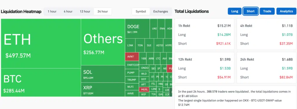 Nelle ultime 24 ore il mercato delle criptovalute ha vissuto una fase di forte turbolenza, con liquidazioni complessive pari a 1,68 miliardi di dollari secondo i dati di CoinGlass. Bitcoin ha inciso in modo rilevante con circa 285 milioni di dollari, derivanti soprattutto da posizioni long forzate alla chiusura durante la brusca discesa registrata nella giornata di ieri.