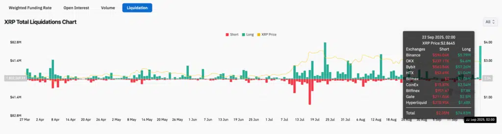 La giornata di oggi, ha visto Ripple al centro di un’ondata di liquidazioni che ha contribuito a un deciso calo del prezzo. Secondo i dati di CoinGlass, le liquidazioni totali hanno raggiunto quasi 77 milioni di dollari, di cui circa 74,8 milioni relative a posizioni long e soltanto poco più di 2 milioni a posizioni short. Questo squilibrio ha determinato vendite forzate che hanno spinto XRP a un ribasso intraday di circa il 6% rispetto ai massimi.