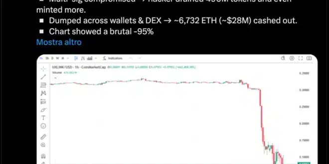 Subito il malintenzionato ha dumpato grosse quote su DEX, capitalizzando $28 milioni di profitti, inviando poi altre monete su exchange, dove ha proseguito le vendite. In poche ore $UXLINK è crashato di oltre il -90%, salvo poi riuscire leggermente a rimbalzare, ma rimanendo comunque schiacciato sul grafico. Al momento della stesura il token quota $0,09 con una market cap di $49 milioni.