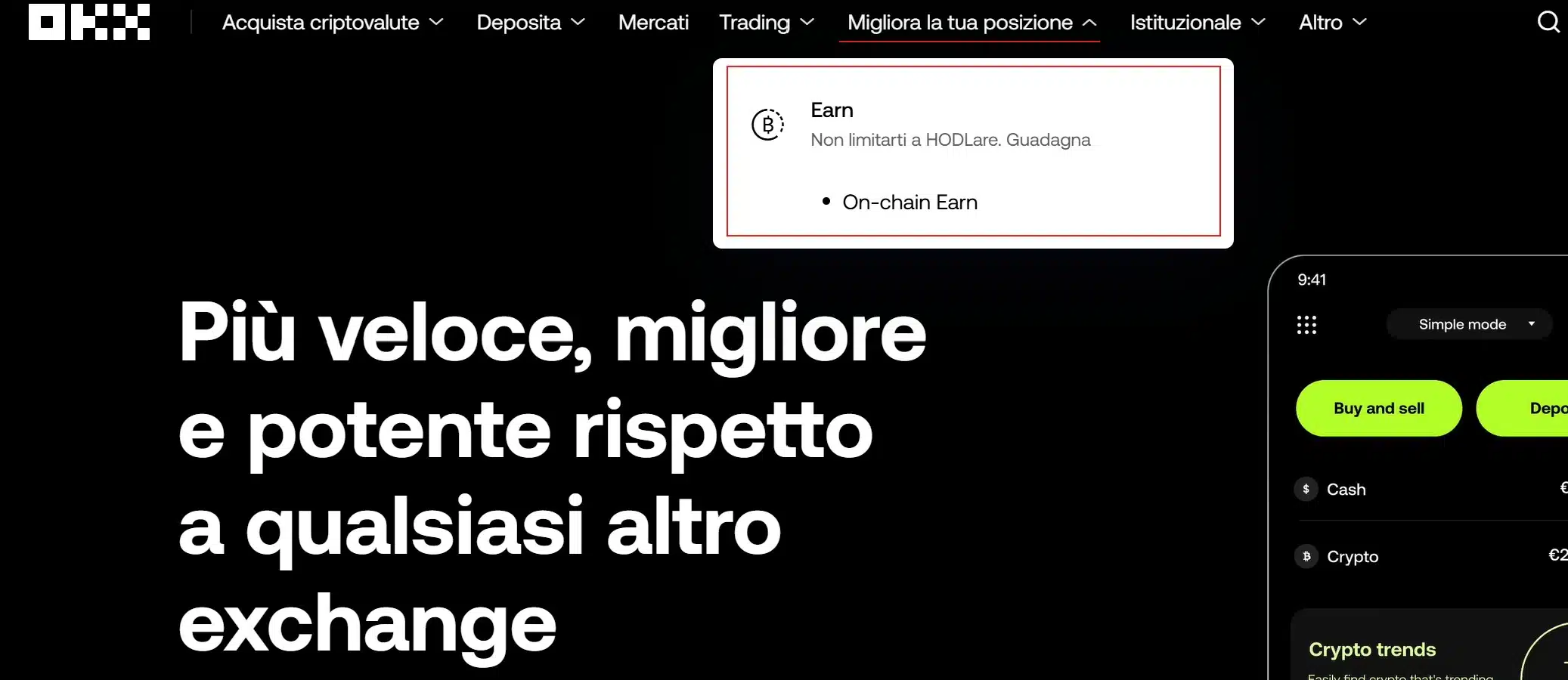 Nato nel 2017, sta continuando ad espandere a macchia d’olio i suoi servizi ed è divenuto un concreto punto di riferimento sia per investitori esperti che per i principianti. OKX Earn è una funzionalità presenti ad oggi su molti exchange, anche se tramite OKX è possibile beneficiare di vantaggi non da poco e dell’accesso al più innovativo On-chain Earn, che avremo modo di scoprire in modo molto semplificato.