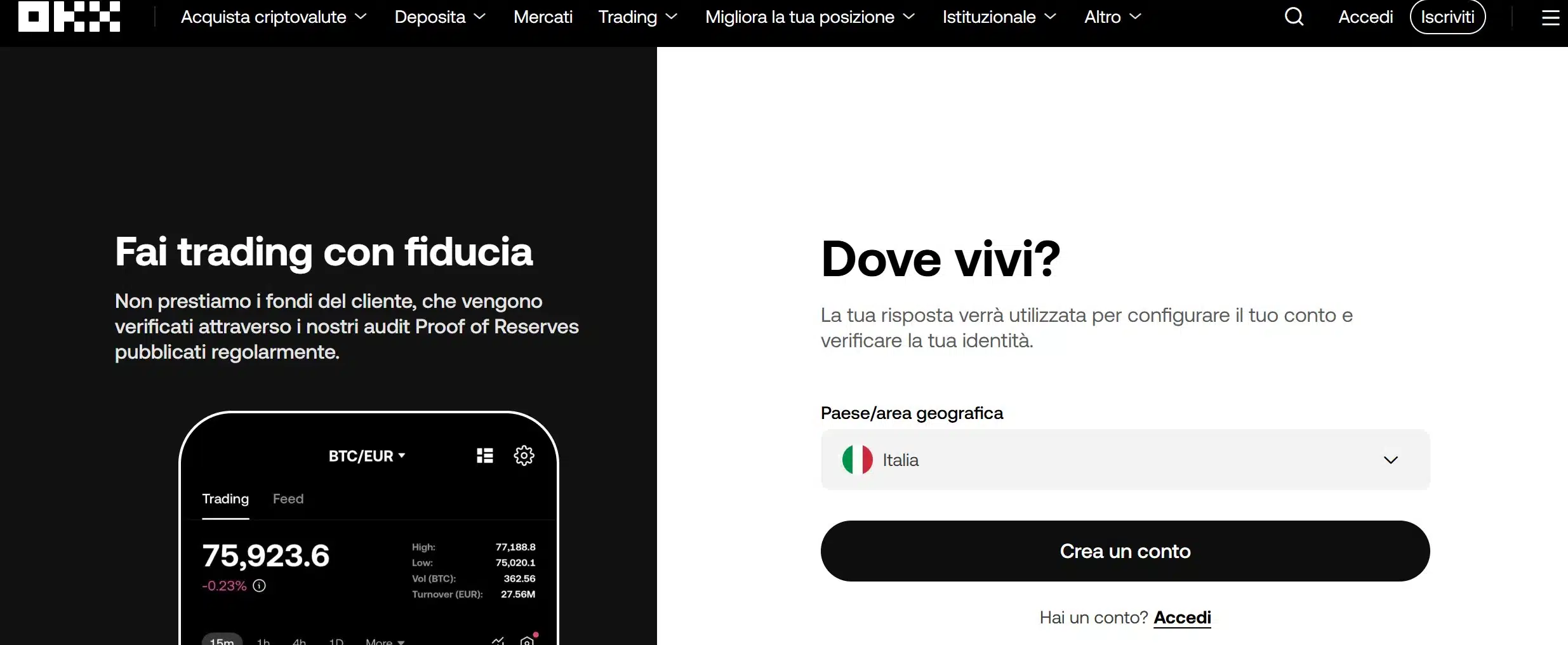 Il primo passo per poter utilizzare i servizi di OKX Earn, è quello della registrazione. Per aprire un account sulla piattaforma puoi recarti sulla pagina ufficiale (qui il link diretto) e cliccare sul pulsante che trovi in alto a destra, indicante “Iscriviti”.