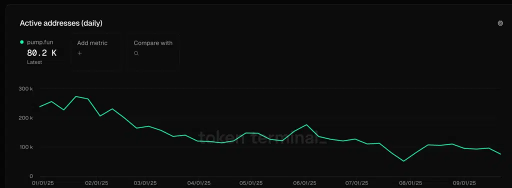 Secondo i dati di Token Terminal, gli “Active daily addresses” giornalieri sulla piattaforma Pump.fun (e non il token PUMP) sono scesi a 80,2 mila unità. Dopo un picco vicino ai 300 mila a inizio anno, la curva ha mostrato un progressivo calo, con stabilizzazioni temporanee e nuovi minimi durante l’estate.