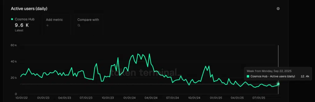 Secondo i dati di Token Terminal, il Cosmos Hub mostra un’evoluzione significativa della metrica “Active Users (daily)”. Dopo i picchi registrati tra il 2023 e il 2024, la curva evidenzia un calo progressivo durante il 2025, segnalando un ridimensionamento della partecipazione quotidiana alla rete. Nella settimana del 22 settembre 2025 gli utenti attivi giornalieri sono stati circa 12,4k, in leggera crescita rispetto ai livelli precedenti, ma comunque inferiori ai massimi storici dell’ecosistema.
