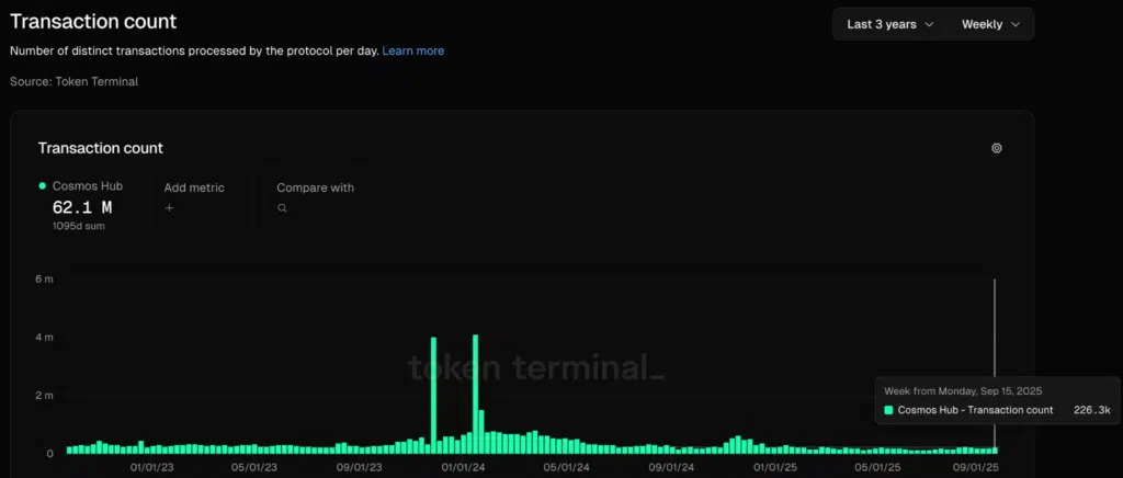 Secondo i dati di Token Terminal, il Cosmos Hub mostra una dinamica interessante nel conteggio delle transazioni. La metrica Transaction Count evidenzia un totale di 62,1 milioni negli ultimi tre anni, con picchi particolarmente marcati a inizio 2024. Più di recente, nella settimana del 15 settembre 2025, il numero di transazioni settimanali si è attestato a circa 226,3k, segnalando un livello di attività inferiore rispetto ai massimi ma comunque stabile.