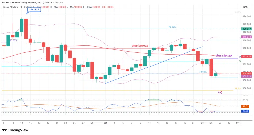 Appena una settimana fa, nella nostra ultima analisi, scrivevamo che Bitcoin (BTC) stava vivendo uno dei suoi migliori settembre degli ultimi 13 anni, registrando un +7,45%. Lo scenario, però, in questi sette giorni è cambiato: attualmente BTC quota 109.690 USD e su base settimanale è in contrazione del –4,86%.