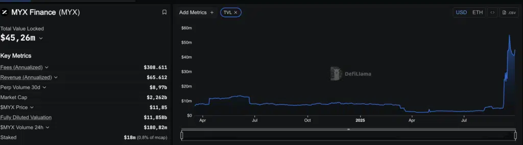 A supporto dell’articolo di Alessandro vi aggiorniamo sulla TVL di MYX Finance che attualmente è a 45,26 milioni di dollari.