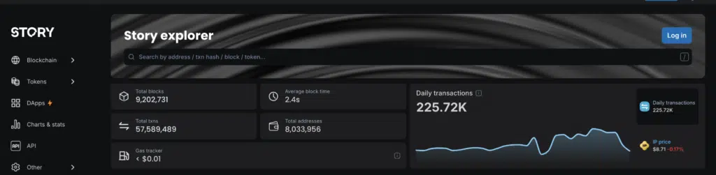 I dati on-chain di StoryScan mostrano circa 225K transazioni giornaliere, oltre 57,5 milioni di transazioni totali, più di 8 milioni di indirizzi attivi e fee inferiori a 0,01 USDT, con tempo medio di blocco pari a 2,4 secondi.