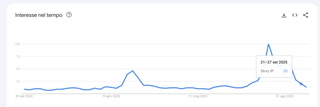 Il grafico di Google Trends relativo a Story IP mostra un interesse inizialmente contenuto fino alla primavera 2025, con un primo picco moderato tra febbraio e marzo sulla quotazione del token. L’attenzione esplode a fine settembre, raggiungendo il massimo storico, per poi calare rapidamente nelle settimane successive.
