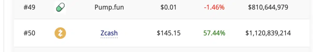 Il rialzo di Zcash nelle ultime 24 ore è stato del +57%, riportandola alla posizione numero 50 della classifica della capitalizzazione di mercato con 2,360 miliardi di dollari.