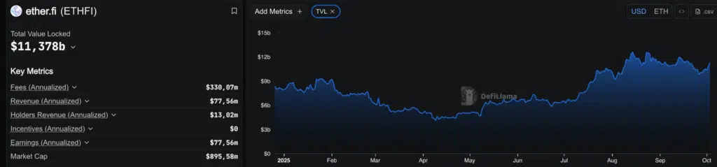 Il rialzo del prezzo si accompagna al consolidamento di Ether.fi (ETHFI) in DeFi e in particolare nel settore del liquid restaking con una TVL (total value locked) pari a 11,37 miliardi dollari, secondo i dati DeFiLlama. L’andamento degli ultimi mesi evidenzia una forte crescita: dai minimi di aprile, intorno a 5 miliardi di USD, il protocollo ha più che raddoppiato i valori, raggiungendo in agosto un massimo oltre i 12 miliardi.