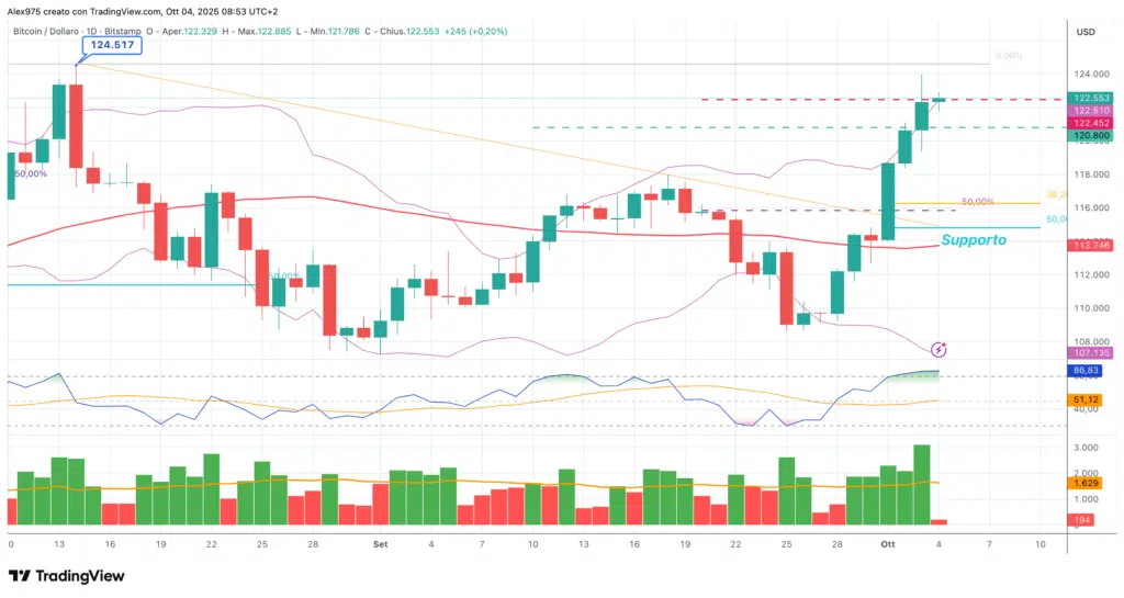 Uptober per Bitcoin (BTC) sta iniziando, come si suol dire, “alla grande”. Attualmente registra su base weekly un +7,10%, con il prezzo che al momento di questa stesura quota 122.400$. Nei primi quattro giorni del mese il rialzo si attesta a +5,40%, che segue il +5,17% di settembre.