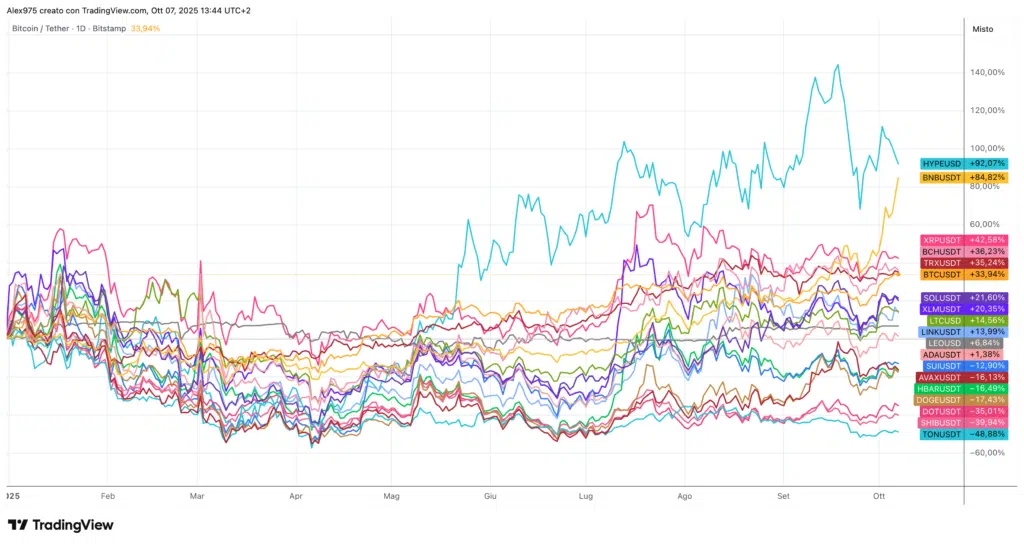 Tuttavia, dall’inizio del 2025, Dogecoin rimane ancora in calo del –17,15%. La performance negativa annuale è imputabile al forte ribasso di inizio anno, quando solo a febbraio il prezzo aveva perso il –38,63% e successivamente a marzo un ulteriore –17%. In allegato riportiamo una panoramica dell’andamento delle principali crypto della Top 20, dove si può osservare come DOGE sia ancora nella pattuglia di quelle in rosso.