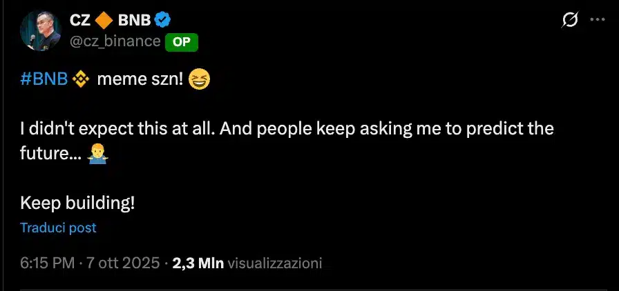 L’ecosistema Binance continua a far parlare di sé e ad ottenere ottimi risultati: a seguito dell’incredibile successo speculativo del token $ASTER e del grande rally di $BNB verso nuovi massimi storici, ora il sommo CZ sta cercando di cavalcare l’onda e spingere una cosiddetta “meme season”.