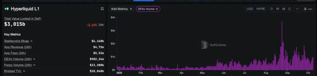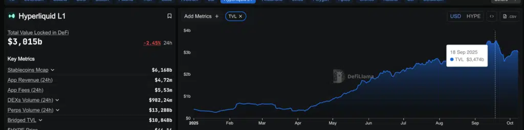 Il Total Value Locked (TVL) di Hyperliquid è sceso a 3,01 miliardi dopo il picco di metà settembre a 3,47 miliardi, segnale di rallentamento nel flusso di capitali.