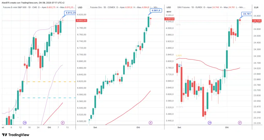 Nella sessione notturna l’S&P 500 ha segnato un nuovo massimo storico a 6.812,25, mentre in Europa il DAX ha toccato il nuovo ATH a 24.761 superando il picco di luglio. Anche l’oro ha aggiornato i massimi, raggiungendo quota 4.081$ l’oncia.