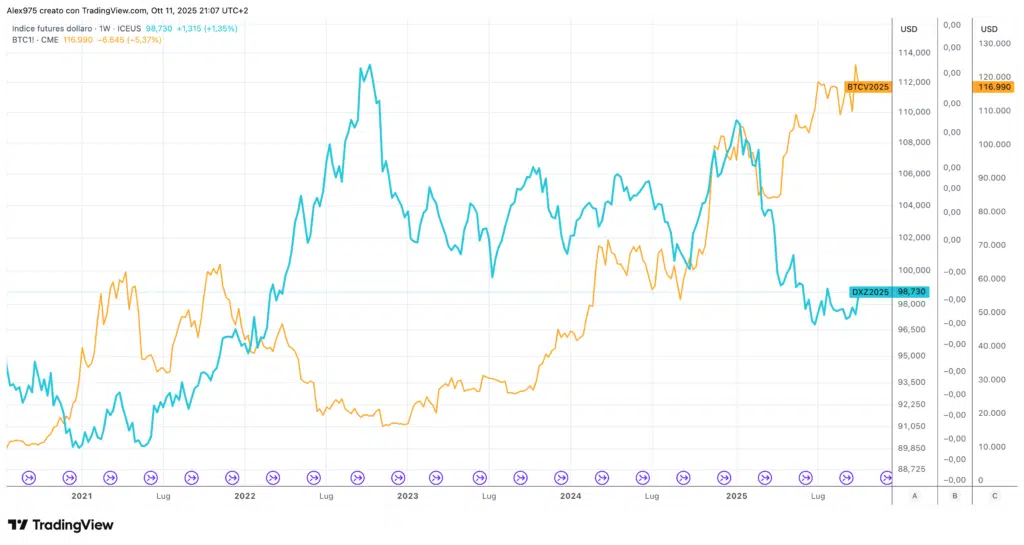 Negli ultimi quindici anni, l’evoluzione del Bitcoin (BTC) ha mostrato una relazione sempre più chiara con la forza o la debolezza del dollaro. Nei periodi di dollaro forte, come nel 2014–2015, nel 2018–2019 e nella seconda metà del 2022, Bitcoin ha sofferto, riflettendo restrizione monetaria e minore propensione al rischio. Al contrario, nei momenti di dollaro debole, come tra il 2016–2017 o nel biennio 2020–2021, BTC ha vissuto fasi di espansione intensa, sostenuta dall’allentamento della liquidità. Quella attuale del 2025 è ancora in costruzione.
