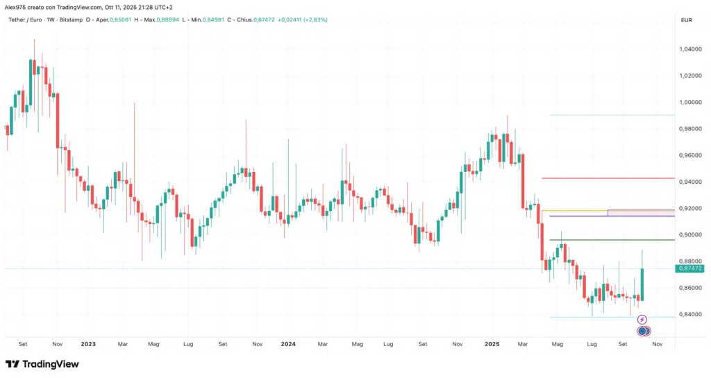 Nel mercato delle crypto, il rapporto USDT/EUR può essere interpretato come una coppia valutaria del Forex. L’USDT, stablecoin ancorata al dollaro, è la valuta base; l’euro è quella quotata. Quando il cross sale, il dollaro si rafforza; quando scende, si indebolisce.