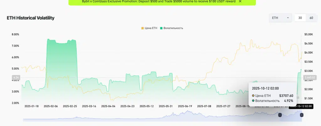 La volatilità storica di Ethereum secondo i dati di CoinGlass, è risalita dal 3% al 4,92% il 12 ottobre 2025, in corrispondenza con il calo del prezzo fino a 3.507$. Dopo mesi di stabilità, ETH torna quindi a mostrare una forte oscillazione, segnale di crescente incertezza tra gli operatori.