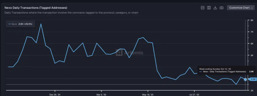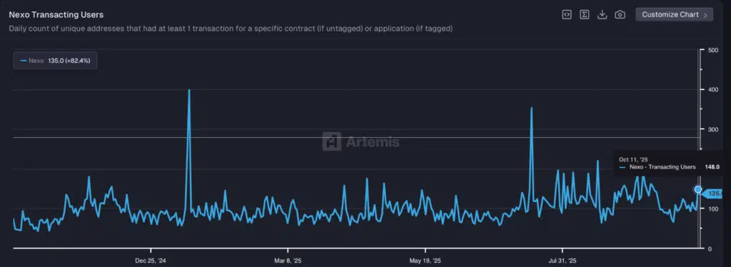 Il grafico mostra un’attività generalmente stabile ma con alcuni picchi sporadici di incremento, come quelli osservati tra maggio e luglio 2025. Nella settimana terminata l’11 ottobre 2025, gli utenti transazionali giornalieri si attestano su una media di 135, con un incremento dell’82,4% rispetto al periodo precedente, segnalando un temporaneo aumento dell’interazione on-chain con il token NEXO.