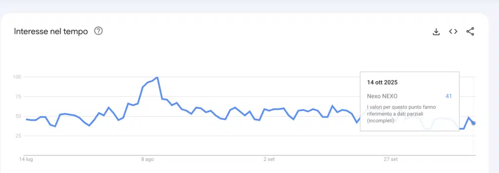Il grafico Google Trends mostra un calo dell’interesse per Nexo dopo il picco di agosto 2025, quando l’indice aveva toccato quota 100. Da settembre l’attenzione è rimasta stabile tra 40 e 55 punti; al 14 ottobre 2025 il valore parziale è 41, segnalando un interesse moderato.