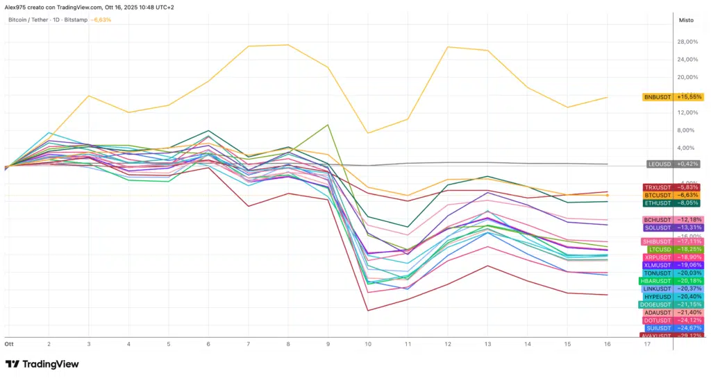 Nel grafico allegato, che riporta la panoramica delle crypto Top 20 per capitalizzazione, si osserva come Tron, pur chiudendo ottobre con un calo del -5,80%, risulti la seconda miglior crypto del mese, dietro BNB, unica in territorio positivo con un rialzo di +15%.