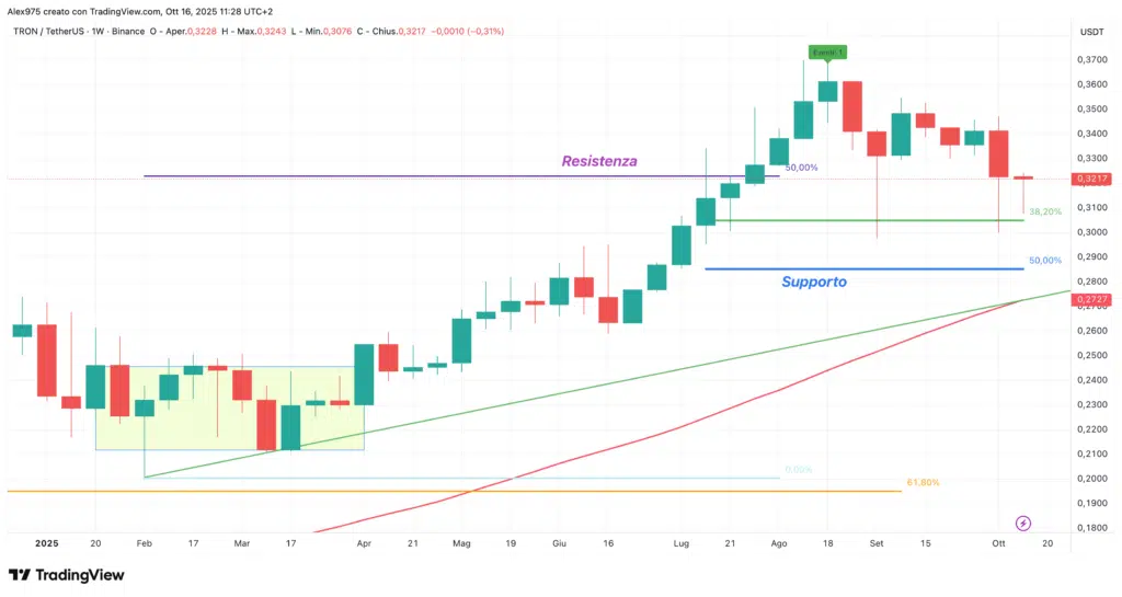 Ripartiamo da quanto già evidenziato nel nostro articolo del 29 settembre Rally finito per Tron? Settembre in rosso e test dei supporti per $TRX [Analisi]. Qui avevamo sottolineato che Tron aveva iniziato a mostrare i primi segnali di rallentamento come si può osservare dal grafico weekly.