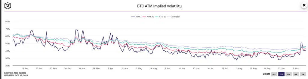 Questa tensione sta prezzando un netto rialzo della volatilità implicita delle opzioni su Bitcoin, come si vede dal grafico di The Block che alleghiamo. Dopo mesi di bassa volatilità, con valori compresi tra il 35% e il 45%, l’indicatore ATM a 7 giorni è risalito oltre il 55%, segnalando un ritorno di incertezza sul mercato. Anche le scadenze a 30, 90 e 180 giorni mostrano un andamento crescente, confermando un aumento della domanda di copertura e una rinnovata attività speculativa sui derivati.