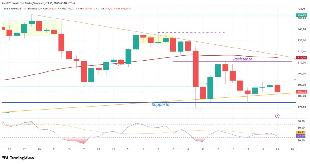 Da questa zona è iniziata una nuova fase di contrazione che ha portato, venerdì scorso, a un nuovo test dei minimi a 175 USDT, da cui il prezzo sta reagendo. In questo contesto, il vettore dominante resta quello che unisce il massimo di settembre al minimo di ottobre: la resistenza chiave da superare rimane a 212 USDT. Poco sopra si collocano anche la SMA 50 e la trendline discendente (evidenziata in arancione).