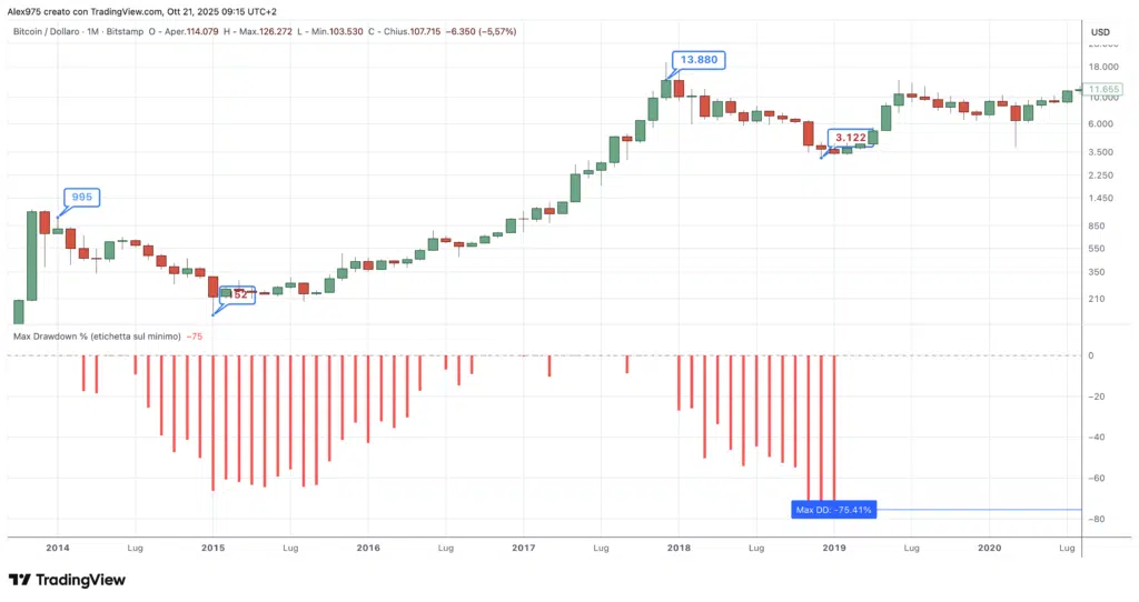 Tra il 2014 e il 2019 Bitcoin ha mostrato una volatilità eccezionale, con oscillazioni mensili anche superiori al 200%. Proprio questa instabilità rende il periodo ideale per testare strategie di lungo periodo come il Piano di Accumulo, che distribuisce gli acquisti nel tempo e attenua gli effetti dei ribassi, migliorando il rendimento medio d’ingresso.