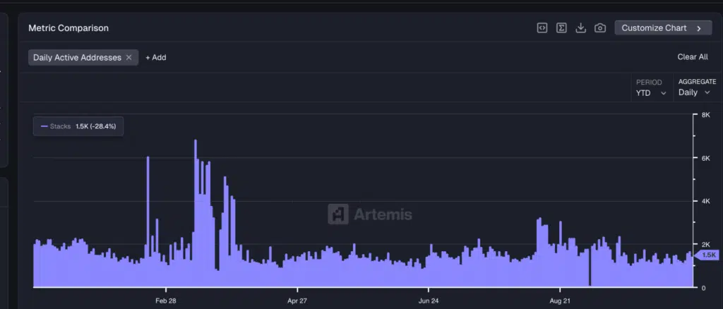 In allegato possiamo osservare la metrica “Daily active addrresses” sulla rete Stacks (STX), un indicatore chiave dell’attività on-chain e dell’utilizzo effettivo della blockchain.