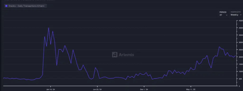 Le metriche on-chain mostrano un picco di oltre 400.000 transazioni settimanali a inizio 2024, poi in calo, ma con una ripresa costante nel 2025 sopra le 200.000 unità.