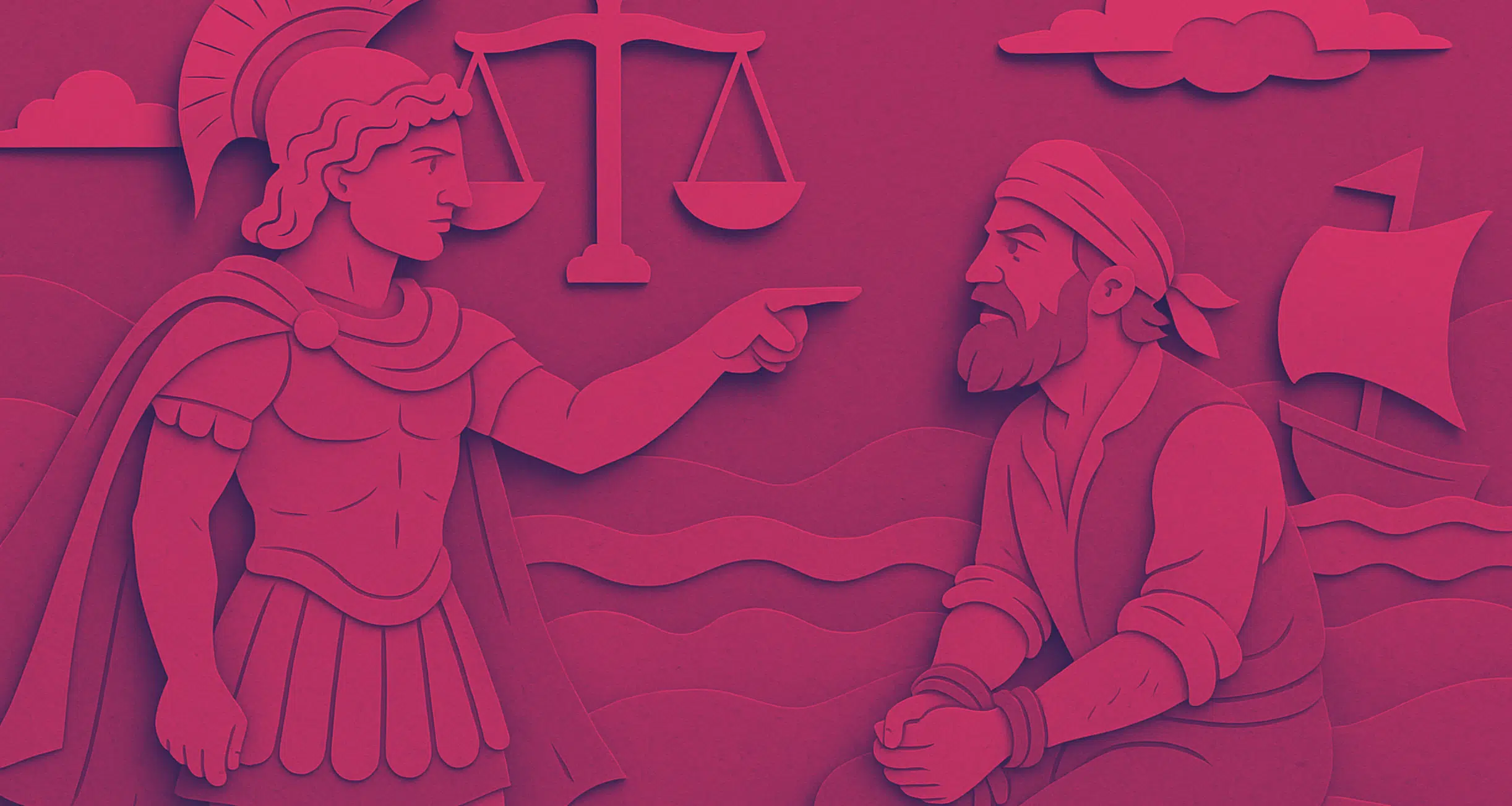 Con finezza e verità a un tempo rispose in questo senso ad Alessandro il Grande un pirata catturato. Il re gli chiese che idea gli era venuta in testa per infestare il mare. E quegli con franca spavalderia: “La stessa che a te per infestare il mondo intero; ma io sono considerato un pirata perché lo faccio con un piccolo naviglio, tu un condottiero perché lo fai con una grande flotta.
