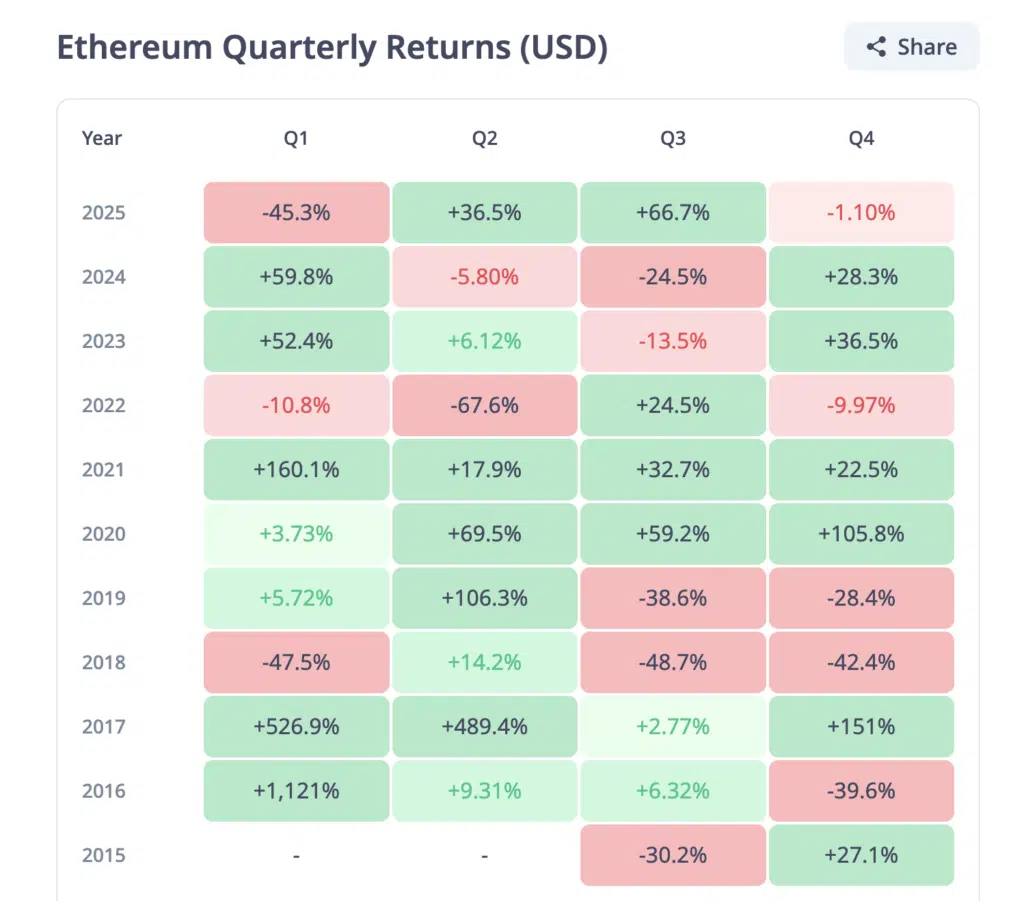 Nella tabella allegata, abbiamo l’analisi dei rendimenti trimestrali di Ethereum dal 2015 al 2024. Escludiamo dal calcolo il 2025 ancora in corso. Da qui emerge che il quarto trimestre è stato positivo in 6 casi su 9, pari al 66,6% del totale. Il rendimento medio del Q4 è di circa +34%, con picchi nel 2017 (+151%), 2020 (+105,8%) e 2023 (+36,5%). Tuttavia il Q2 è il più favorevole ad ETH, che ha chiuso 7 volte su 9 in positivo, con un rendimento medio di circa +87%, molto superiore a quello del Q4 (+34%).