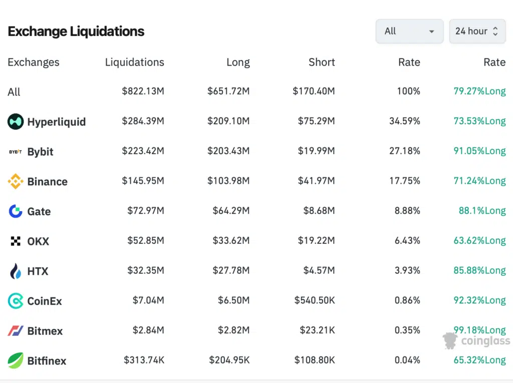 Le liquidazioni delle ultime 24 ore ammontano a 824 milioni di dollari – una cifra importante dati i movimenti relativamente ristretti – e che non può essere considerata come completa, perché intermediari come Binance continuano a diffondere dati che potrebbero essere incompleti.