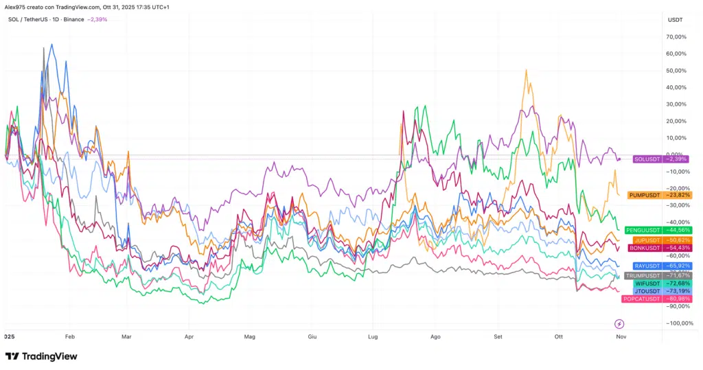 Questo scenario mette in evidenza come, pur rimanendo Solana una delle blockchain più performanti e tecnicamente avanzate, l’ecosistema dei suoi token stia attraversando una fase di contrazione generalizzata.