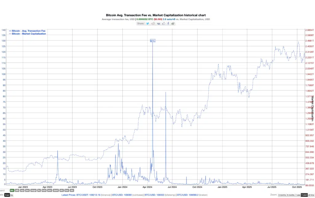 Non necessariamente per valutare il futuro valore dei token legati alle blockchain di cui sopra. Il prezzo delle criptovalute – o almeno di certe criptovalute – è sempre stato slegato da questo tipo di fondamentali. Un esempio classico è quello di Bitcoin. Nel grafico allegato l’unico momento di correlazione tra commissioni (in linea continua) e prezzo (in linea tratteggiata) è stato a fine 2023 – inizio 2024.